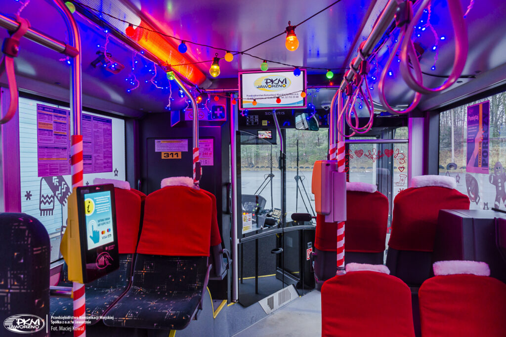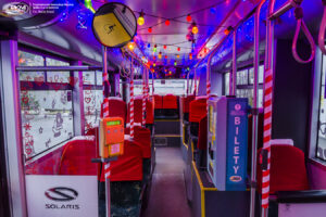 Wnętrze pojazdu zostało ozdobione w sposób, który pozwoli choć na chwilę oderwać się od codziennego pośpiechu. Iluminacje, dekoracje oraz świąteczne akcenty tworzą niepowtarzalną atmosferę – taką, która ma przypominać, że komunikacja miejska to nie tylko transport, ale również przestrzeń wspólnoty, życzliwości i pozytywnej energii.